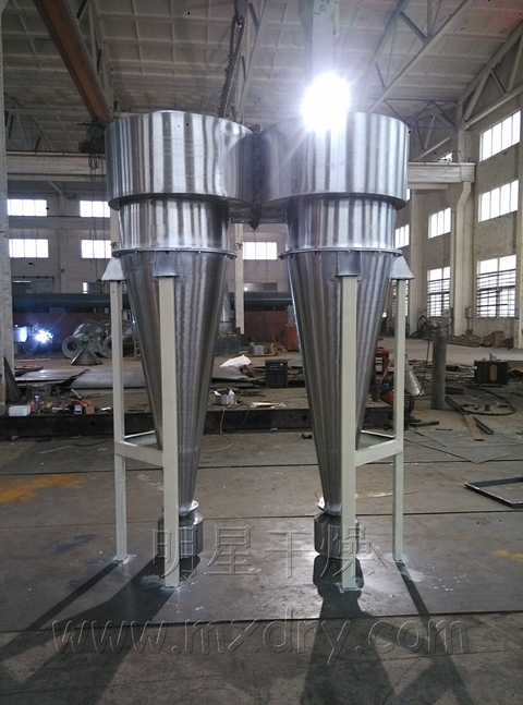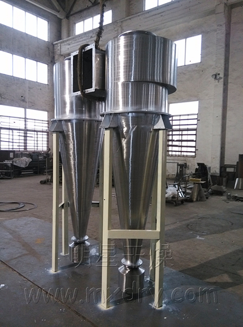 旋風分離器,是用于氣固體系或者液固體系的分離的一種設備。工作原理為靠氣流切向引入造成的旋轉運動,使具有較大慣性離心力的固體顆粒或液滴甩向外壁面分開。旋風分離器的主要特點是結構簡單、操作彈性大、效率較高、管理維修方便,價格低廉,用于捕集直徑5~10μm以上的粉塵,廣泛應用于制藥工業中,特別適合粉塵顆粒較粗,含塵濃度較大,高溫、高壓條件下,也常作為流化床反應器的內分離裝置,或作為預分離器使用,是工業上應用很廣的一種分離設備。