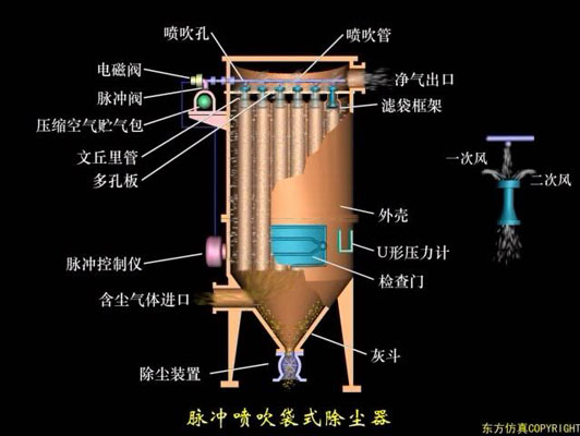脈沖布袋除塵器工作時(shí),含塵氣體由進(jìn)風(fēng)道進(jìn)入灰斗,粗塵粒直接落入灰斗底部,細(xì)塵粒隨氣流轉(zhuǎn)折向上進(jìn)入中、下箱體,粉塵積附在濾袋外表面,過濾后的氣體進(jìn)入上箱體至凈氣集合管-排風(fēng)道,經(jīng)排風(fēng)機(jī)排至大氣。 清灰過程是先切斷該室的凈氣出口風(fēng)道,使該室的布袋處于無氣流通過的狀態(tài)(分室停風(fēng)清灰)。然后開啟脈沖閥用壓縮空氣進(jìn)行脈沖噴吹清灰,切斷閥關(guān)閉時(shí)間足以保證在噴吹后從濾袋上剝離的粉塵沉降至灰斗,避免了粉塵在脫離濾袋表面后又隨氣流附集到相鄰濾袋表面的現(xiàn)象。