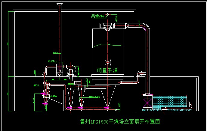 2、干燥塔:直徑φ7米,圓柱體高度11米, 錐體角度20°,有效干燥體積450m3。本設計噴液量為4T/小時,物料的噴距與塔徑有較大的安全系數,可保證物料不粘壁。干燥強度為4,離有關標準和經驗數據有較大裕量。塔體內設置風冷內壁裝置,內壁用304B材質,厚3mm;外壁用Q235材料,厚5mm;中間設有加強骨架和導風板。