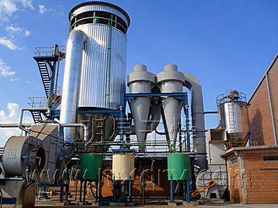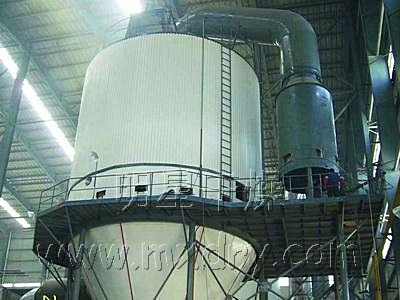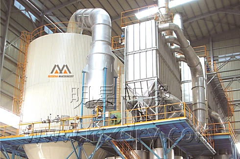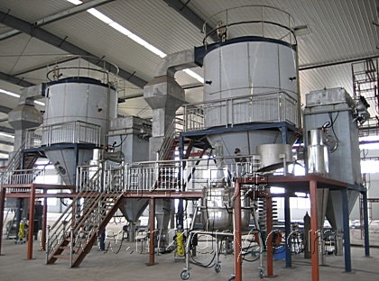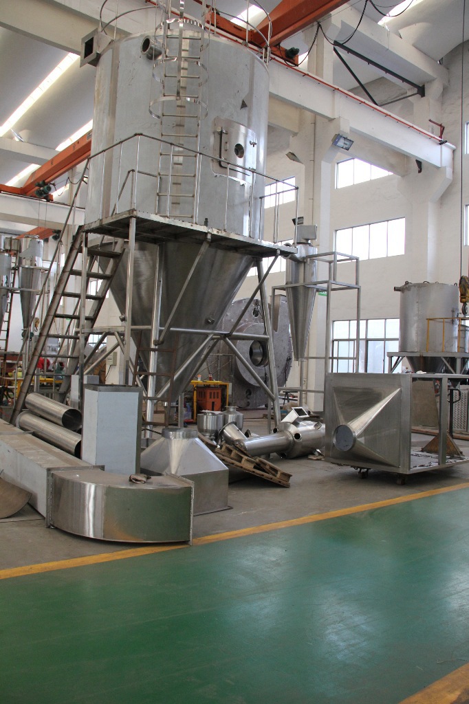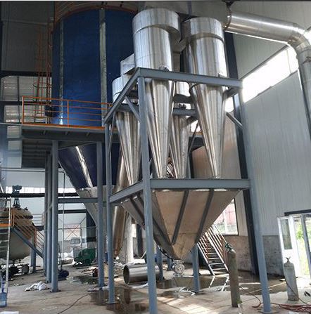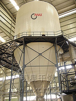 ??空氣經(jīng)過濾和加熱,進入干燥器頂部空氣分配器,熱空氣呈螺旋狀均勻地進入干燥室。料液經(jīng)塔體頂部的高速離心霧化器,(旋轉(zhuǎn))噴霧成極細微的霧狀液珠,與熱空氣并流接觸在極短的時間內(nèi)可干燥為成品。成品連續(xù)地由干燥塔底部和旋風(fēng)分離器中輸出,廢氣由風(fēng)機排空。